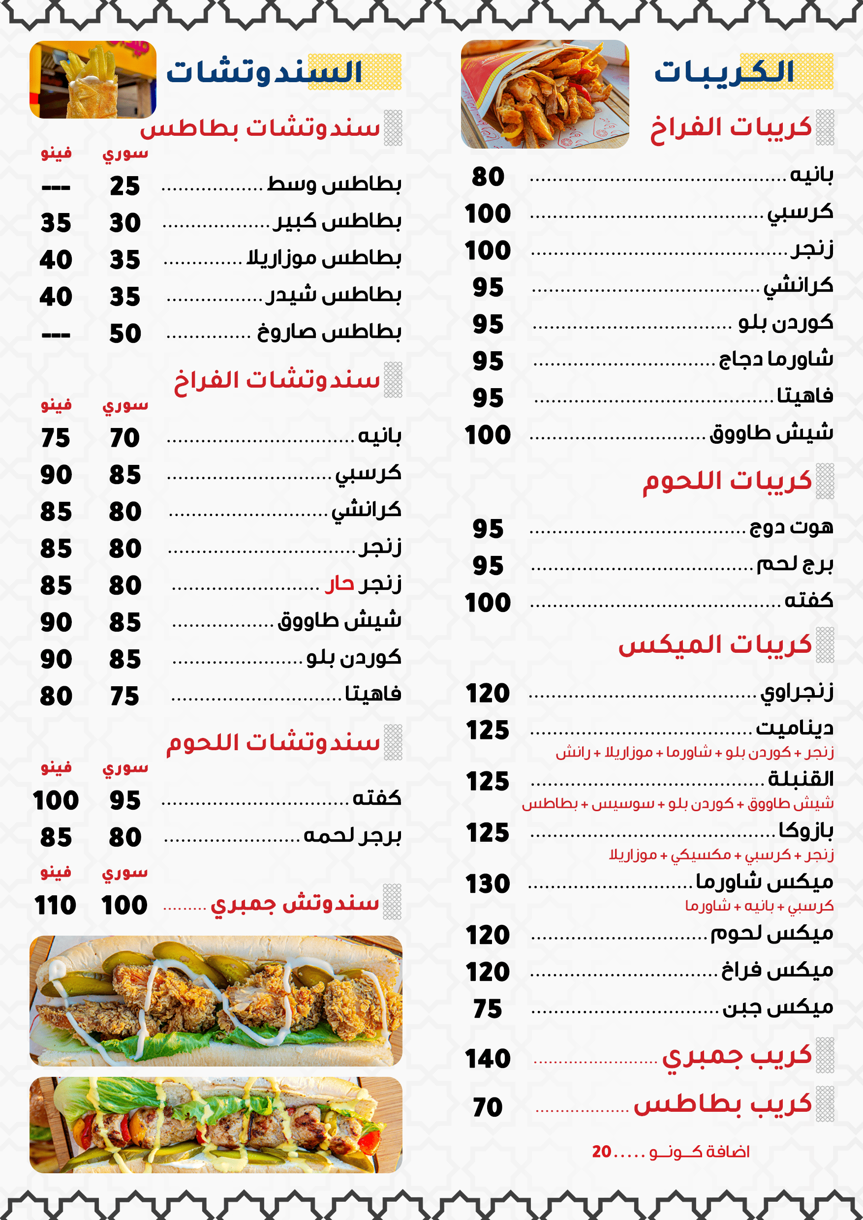 استمتع بأشهى البطاطس السورية والسندوتشات اطلب بسهولة وشوف المنيو كامل قبل ما تطلب 👌