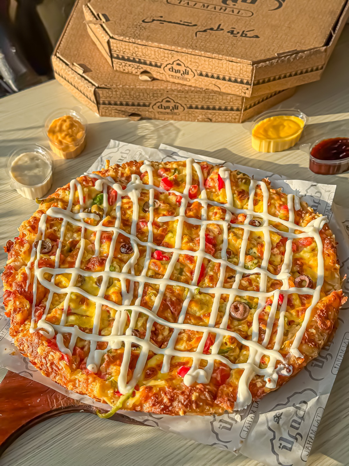 عجين فطير مُضاف له بسطرمة + رومي + موتزاريلا + طماطم + فلفل أخضر + زيتون + بيض
