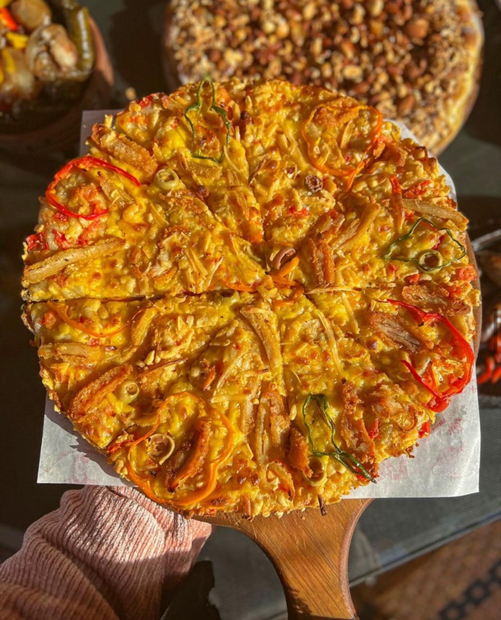 عجين فطير مُضاف له شاورما + استربس + رومي + موتزاريلا + طماطم + فلفل أخضر +